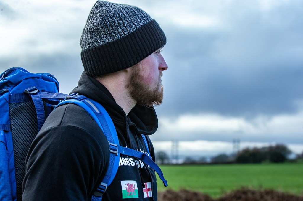 Dan Simms is almost 100 miles into his long walk from Wales to Amsterdam for men’s mental health and suicide prevention.